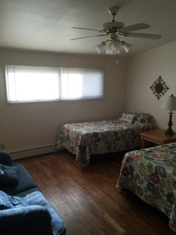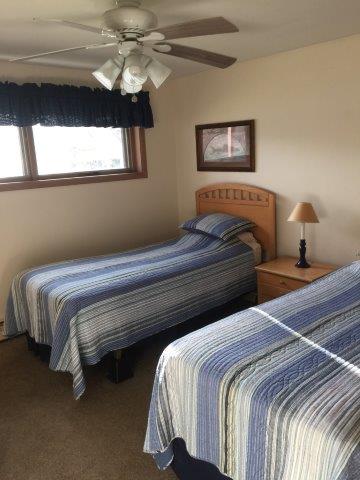 NRGLR! NRGLR has a total of four independent bedrooms. Two are located upstairs and two downstairs. Each room has more than two windows, a ceiling fan, and night stand. Each room has two twin beds which can be kept separate or merged together if you choose. Each room does have a full cedar closet and a laundry basket. The rooms are carpeted and very clean. NRGLR provides clean sheets, pillows, and covers. Additional bedding is available in the laundry closet! The home can easily accommodate 8 adults. Both rooms on each floor are located by a full bathroom. The main bedrooms upstairs and downstairs do have entry doors that lead to the 1000 sq. ft. deck or the patio below the deck. Back To House Description