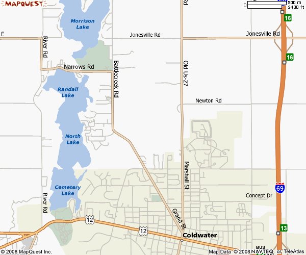 This map depicts your final destination. Take exit #16 off I-69. You will need to go west on Jonesville Rd, approximately 1 mile. When you come to the end of Jonesville Rd, Union City Rd, you will turn left or head South, approximately one quarter mile. The green area indicates Golf Club of Coldwater, just past the course you'll come upon Narrows Rd, turn right or west. You will travel only a quarter mile on Narrows Rd, NRGLR is located on the South side, address 261 Narrows Rd, the mail box is on the North side, you should also see the NRGLR rental sign.