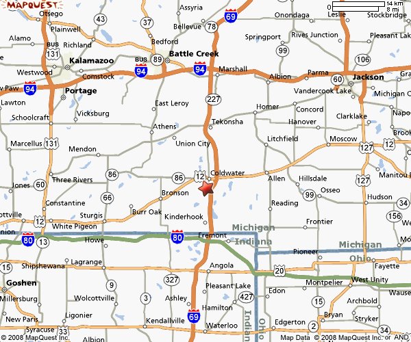 The red star indicates the city of Coldwater. I-69 is main Interstate to use. Coldwater is exit 13, you want to exit on Jonesville Rd, exit #16.